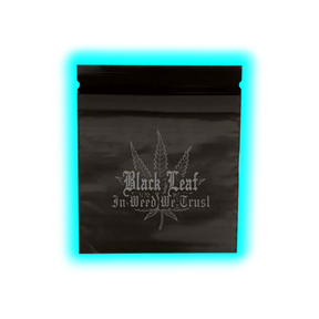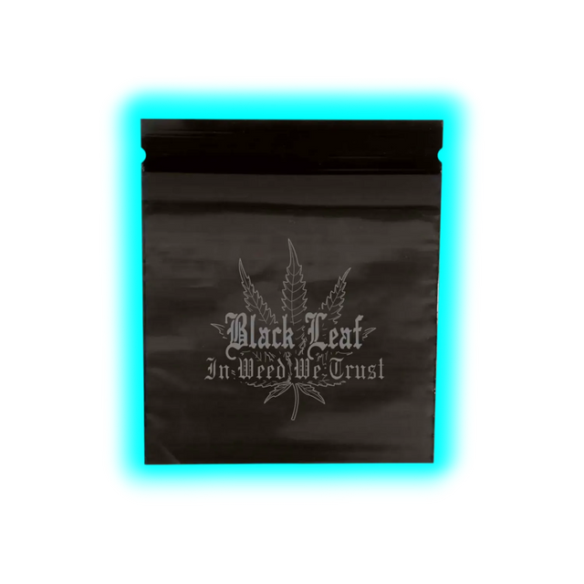 Das markante Black Leaf® Logo in Verbindung mit dem „IN WEED WE TRUST“-Motiv macht diese Beutel zu einem optischen Statement für jeden Kenner.